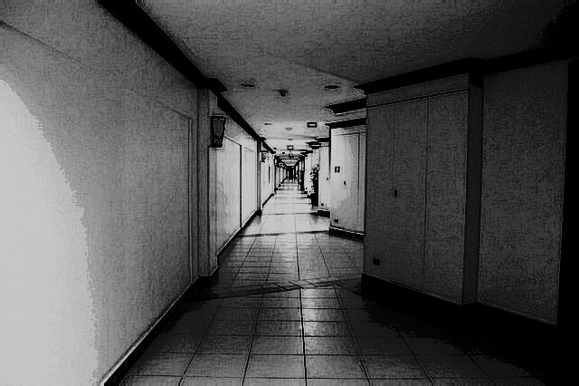어두운 복도 끝에 비상구의 녹색 불만 빛나고 있었다.